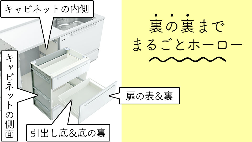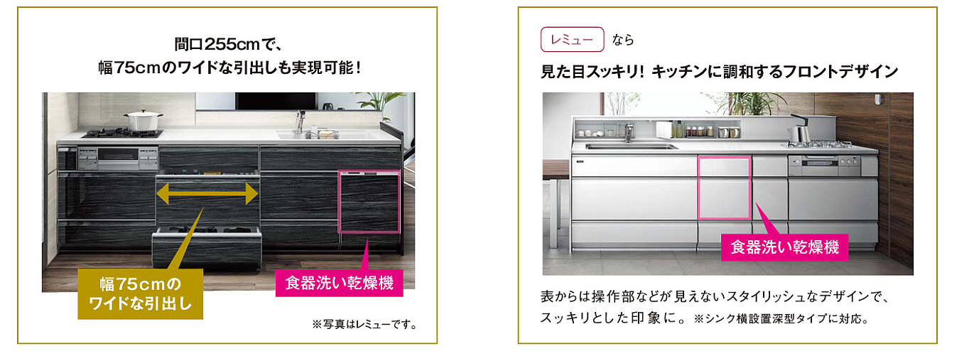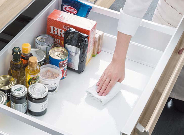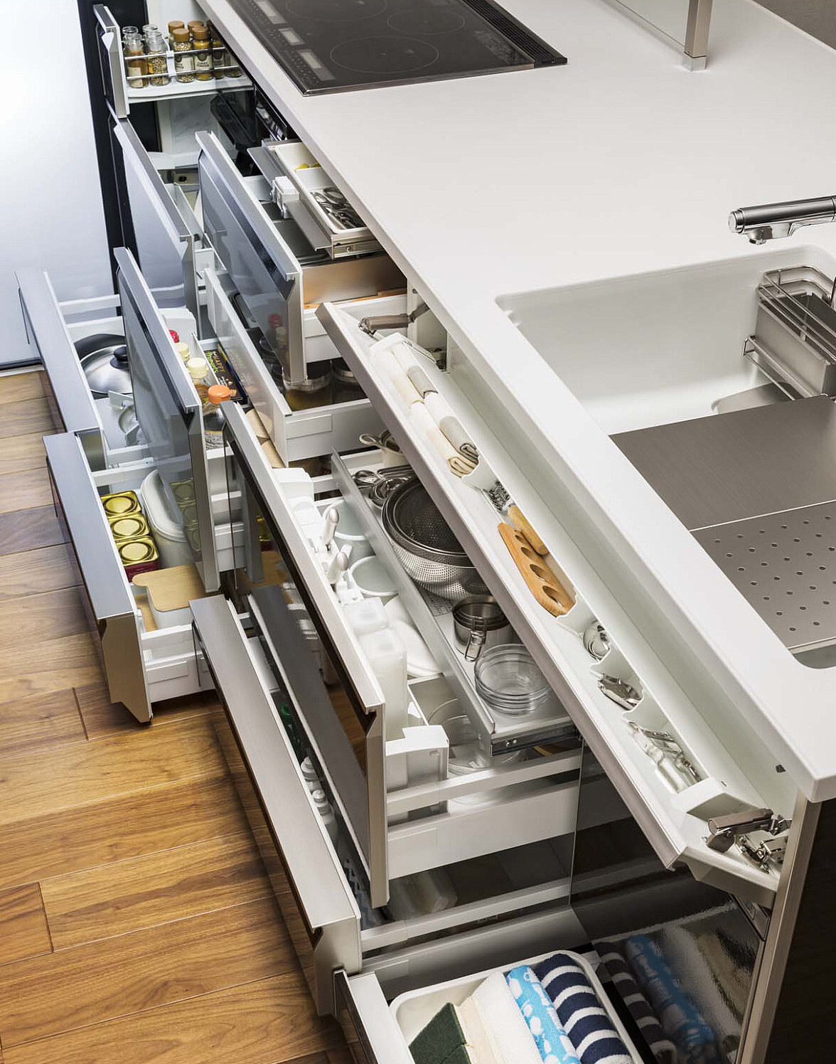 通常、食器洗い乾燥機をシステムキッチンに組み込むと、どうしても調理スペースの引出しが減ってしまいます。タカラでは、食器洗い乾燥機をシンク下に設置できるため、ワイドな引出し幅を確保できます!
