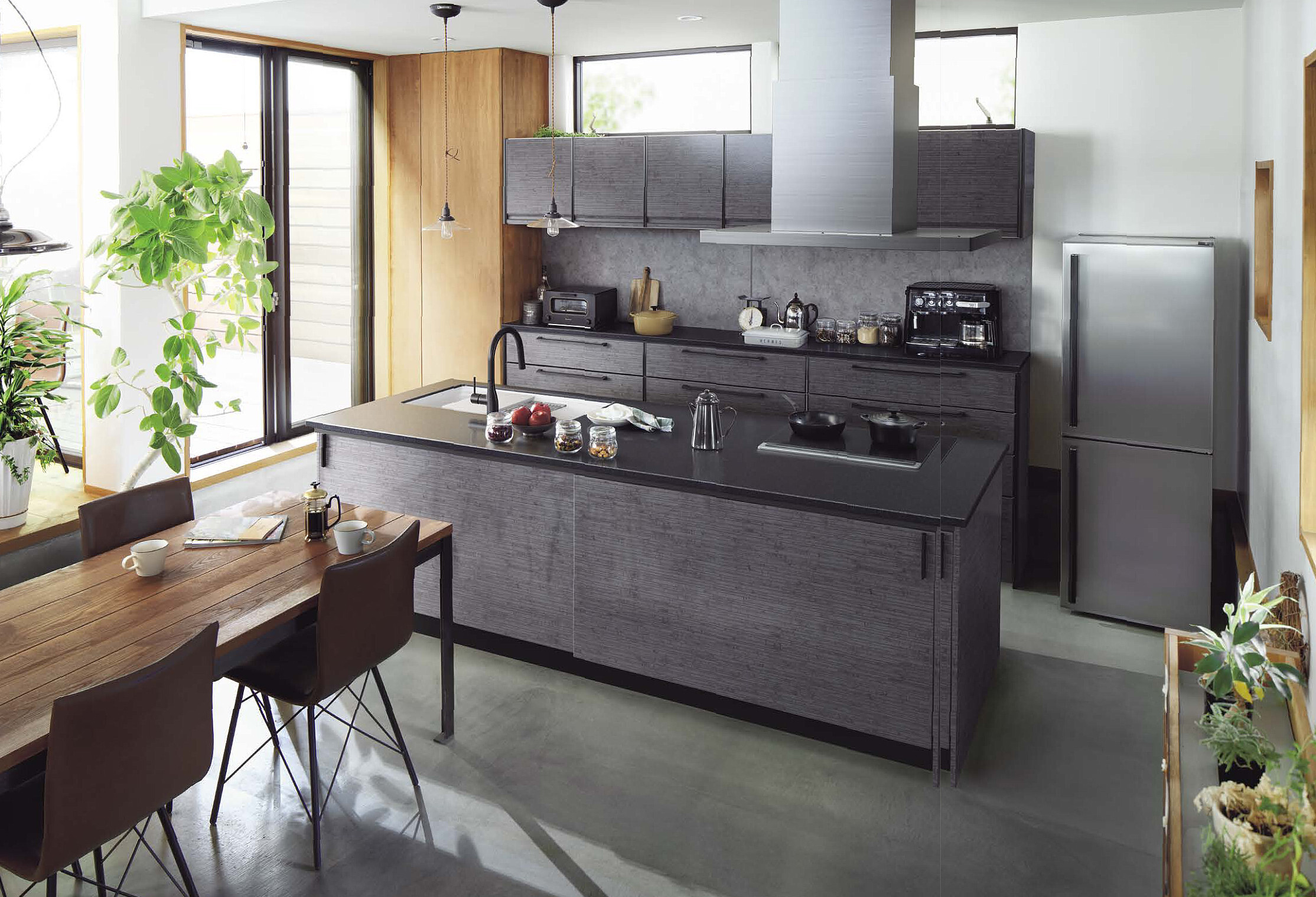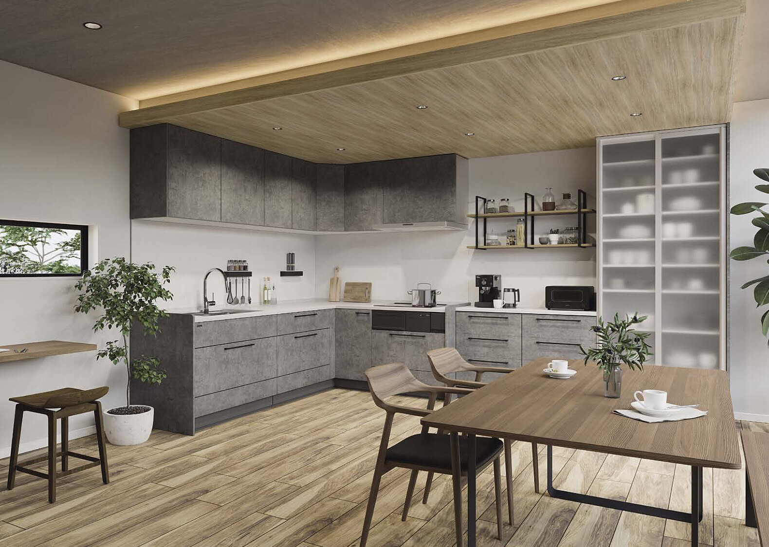 ホーロ―システムキッチンの「レミュー」は、耐水性・耐熱性に優れ、ホーロー素材にも関わらず、マットで上品な質感が特徴です。やきもの、錆、木目、コンクリート柄など、デザイン性あふれる8つのカラーバリエーションからセレクトできます。レミューだけの特徴として、多層にわたる収納設備が挙げられます。