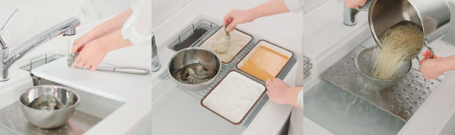 例えば、掃除が大変なエビの下処理も、シンクの上なら、洗いながらキレイに処理できますね。まな板から水気があふれてしまう糸コンニャクも、シンクの上なら、濡れるのを気にせずに調理できます^^
