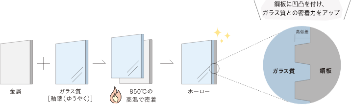 ホーロー(琺瑯)とは、金属の表面にガラス質をコーティングし焼き付けた素材のことです。