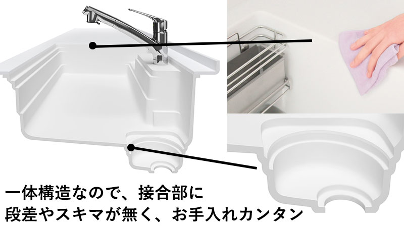 シンクとワークトップ、シンクと排水口の継ぎ目がなく、一体構造。