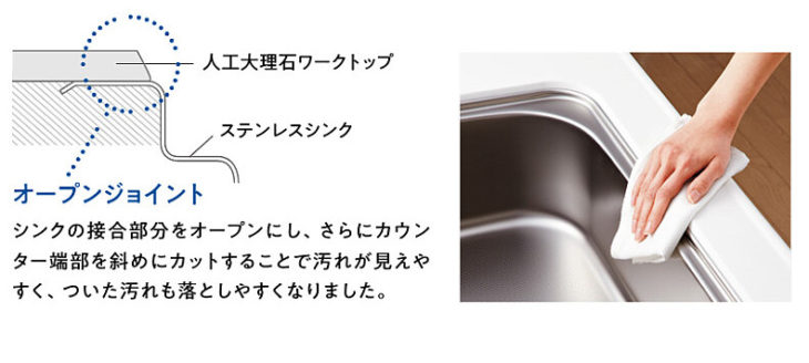 シンクの接合部分をオープンにし、カウンター端部は斜めにカットしました。人工大理石ワークトップとの境目についた汚れが見えやすく落としやすいため、掃除がしやすくなっています。