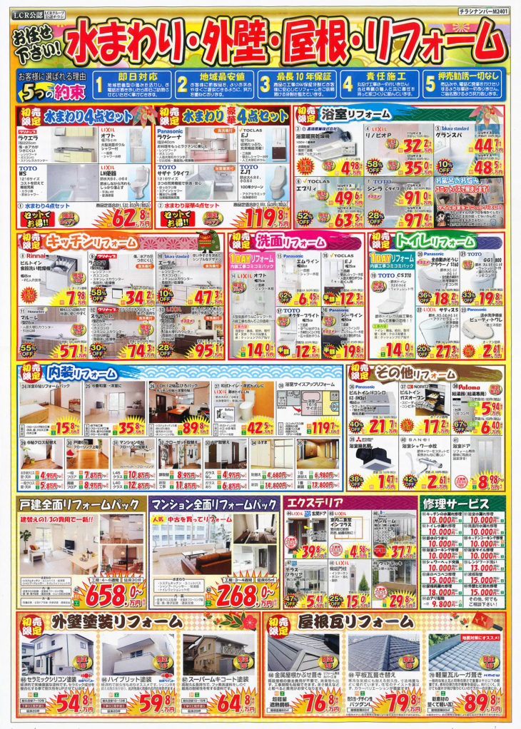 お問い合わせお見積もり お問い合わせ お見積もり LINE相談 HOMEイベント情報最新チラシ情報2024新春初売り大特価! ~1/31 2024新春初売り大特価! ~1/31 明けましておめでとうございます。本年もどうぞよろしくお願い致します。年に一度のリフォーム大特価祭!新春!初売りスタートです。お電話での受付は1/6(土)9時よりスタート。お問合せお待ちしております。限定商品はなくなり次第終了‼数に限りがございますのでお早めにご連絡ください。(商品によりましては、工事着工までお時間を頂戴する可能性がございます。) まずはお電話で現状をご相談ください! 0120-94-7784 【受付】9:00~18:00【定休日】日曜・祝日 メールから問い合わせる 最新チラシ情報一覧はこちら イベント情報一覧はこちら 水回り専門店トイレドックについて 選ばれる理由 会社案内代表挨拶会社概要中小企業庁 事業計画強化計画アクセスマップ リフォームメニュー リフォームメニュー一覧 トイレ エコキュート 給湯器 コンロ 換気扇(レンジフード) キッチン システムバス 洗面化粧台 施工事例 施工事例一覧 トイレのリフォーム・ 便器交換 洗面化粧台の リフォーム交換 キッチン・台所の リフォーム交換 風呂・浴室・ユニットバスの リフォーム交換 内装リフォーム(壁紙の張替え、床・フローリングの 張替え) 家のお困りごと 修理・補修 外壁塗装リフォーム ・外壁工事 お客様の声 お客様の声一覧 お役立ち情報 スタッフブログ LINE簡単見積もり イベント情報 ワーキング・ビー 総合リフォームサイト 屋根外壁のワーキング・ビー お問い合わせ お問い合わせ 無料お見積もり お問い合わせはこちら お見積もりはこちら トップへ戻る ホーム 会社案内 選ばれる理由 会社案内代表挨拶会社概要中小企業庁 事業計画強化計画アクセスマップ リフォームメニュー リフォームメニュー一覧 トイレ エコキュート 給湯器 コンロ 換気扇(レンジフード) キッチン システムバス 洗面化粧台 施工事例 施工事例一覧 トイレのリフォーム・ 便器交換 洗面化粧台の リフォーム交換 キッチン・台所の リフォーム交換 風呂・浴室・ユニットバスの リフォーム交換 内装リフォーム(壁紙の張替え、床・フローリングの 張替え) 家のお困りごと 修理・補修 外壁塗装リフォーム ・外壁工事 お客様の声 お客様の声一覧 お役立ち情報 スタッフブログLINE簡単見積もりイベント情報ワーキング・ビー 総合リフォームサイト屋根外壁のワーキング・ビー お問い合わせ お問い合わせ無料お見積もり © 2022 株式会社マザーリーフ